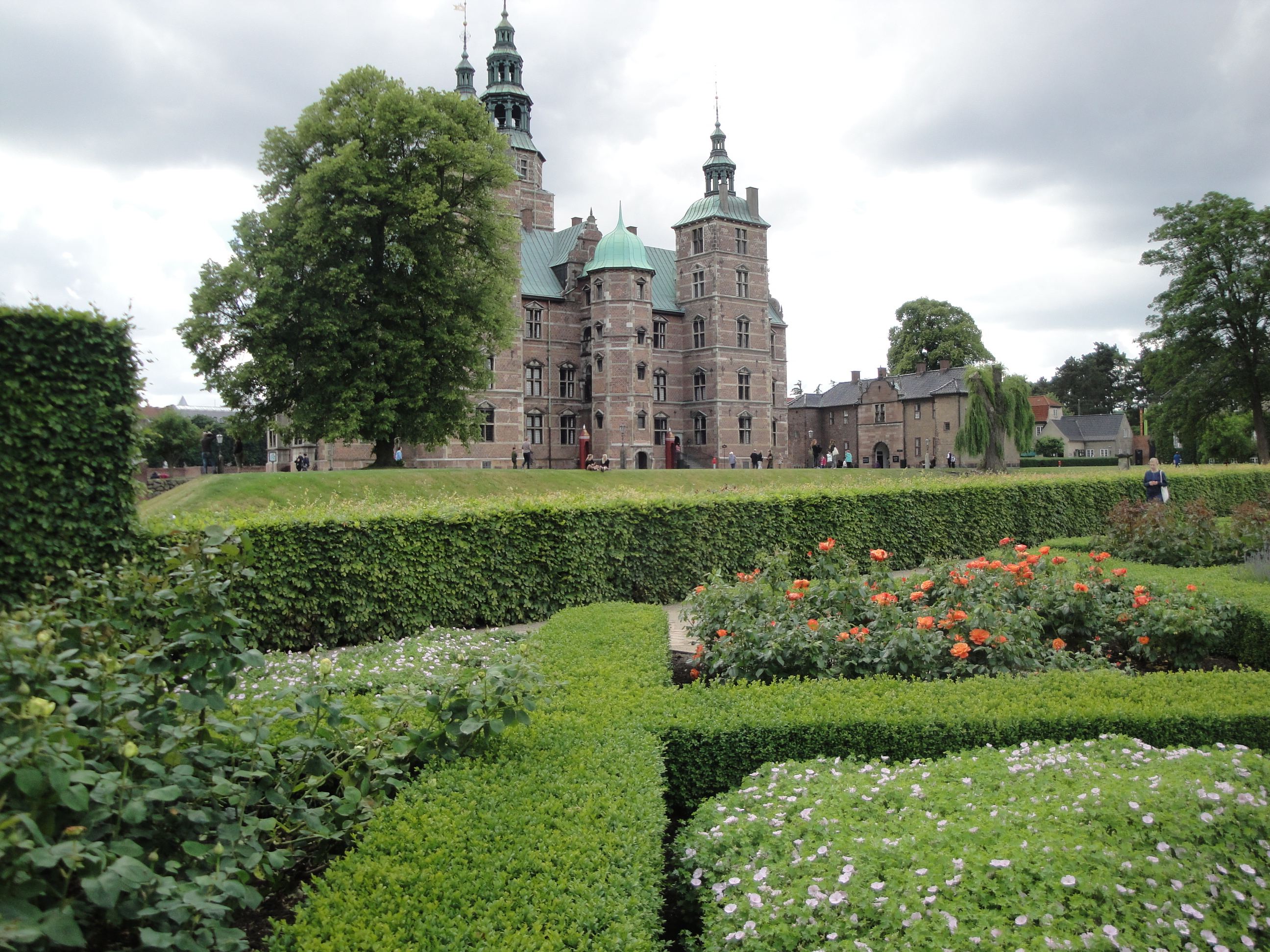 We didn’t make it to Tivoli, but loved walking through two side-by-side garden refuges in the city center. King’s Garden is essentially the front yard to Rosenborg Slot (Rosenborg Castle), the 1606 fortress built by King Christian IV of Denmark. The park is meant for strolling, but it has several elements of interest to gardeners, especially the large formal garden, anchored at one end by the statue of the Dowager Queen Caroline Amalie, who was carrying a bouquet the day we visited. For someone whose home garden is casual to the extreme, the boxwood hedges, perfectly aligned in a diamond pattern, with lavender and roses inside them, was impressive indeed. Sometimes order is relaxing.